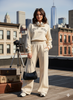 Collar Zip Letter Graphic Sweat & Flare Leg Pants-Cream White